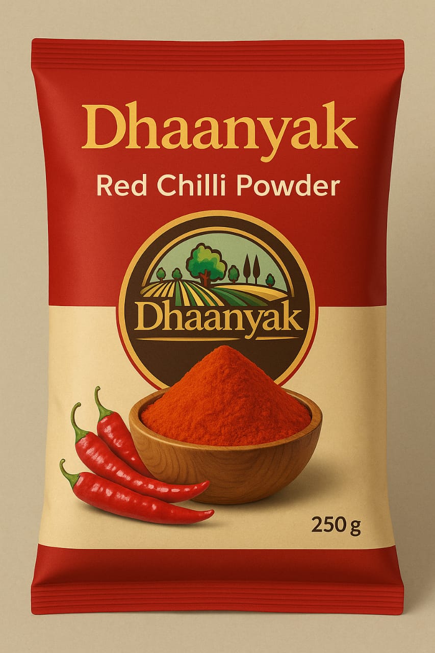 Bring home the perfect blend of spice and purity. Dhaanyak Red Chilli Powder is made from premium-quality sun-dried chillies, ground fresh without any added color or chemicals. It adds a bright, natural red hue and just the right heat to your food — just like your mom’s cooking.